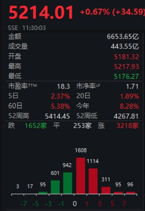 截至午间停盘,A股3218只个股飘红,253只平,1652只下跌,30只个股走出涨停板;半日成交6653.65亿元。