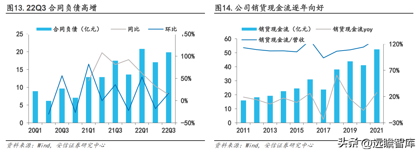 从季度数据看,22Q3销货现金流16.35亿,同比-0.13%,销货现金流/营收为114.34%,反应经销商打款积极。22Q3合同负债19.84亿元,同比+13.50%,环比+16.36%,体现疫情扰动下,公司仍能保持较好的回款增速。