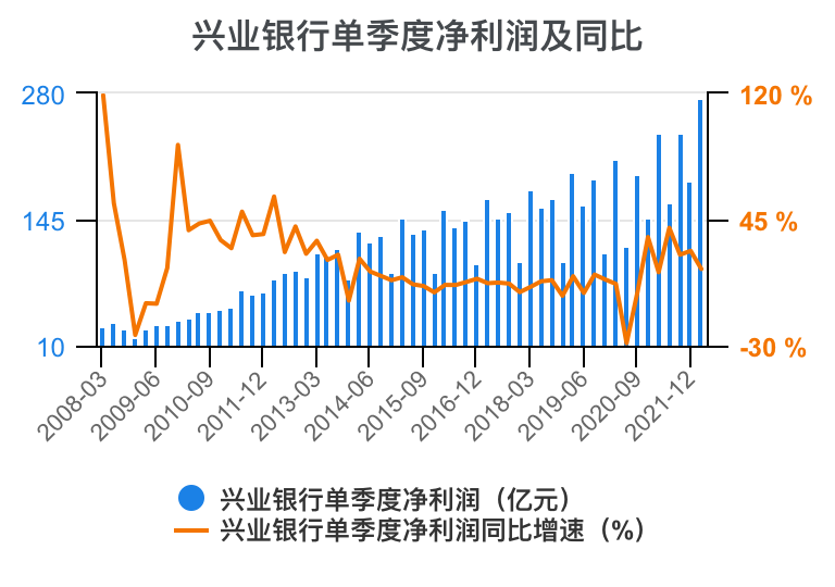 兴业银行单季度净利润,2022-03期数据为276亿元。兴业银行单季度净利润同比增速,2022-03期数据为15.6%。