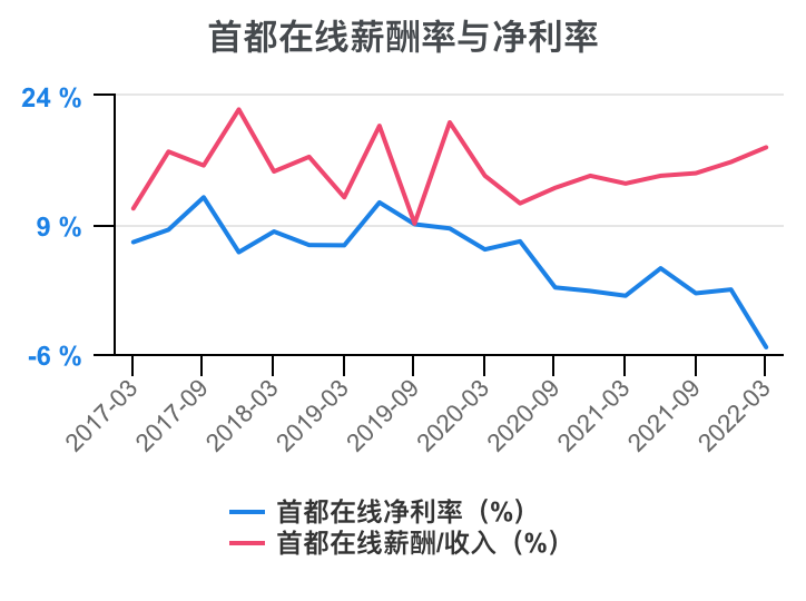 首都在线薪酬/收入,2022-03期数据为18%。首都在线净利率,2022-03期数据为-5.22%。