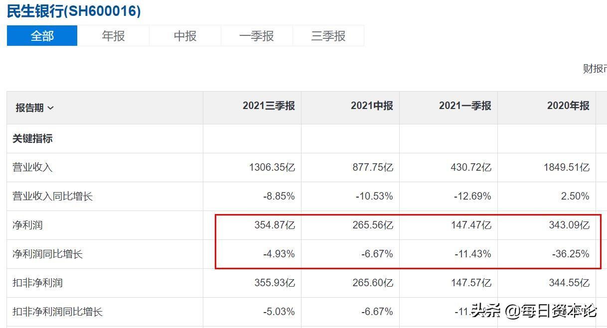 而且也要注意到,2021年一季度到三季度,虽然民生银行的净利润同比仍然为负增长,但幅度逐渐缩小。没准,年报会有一个小惊喜呢?