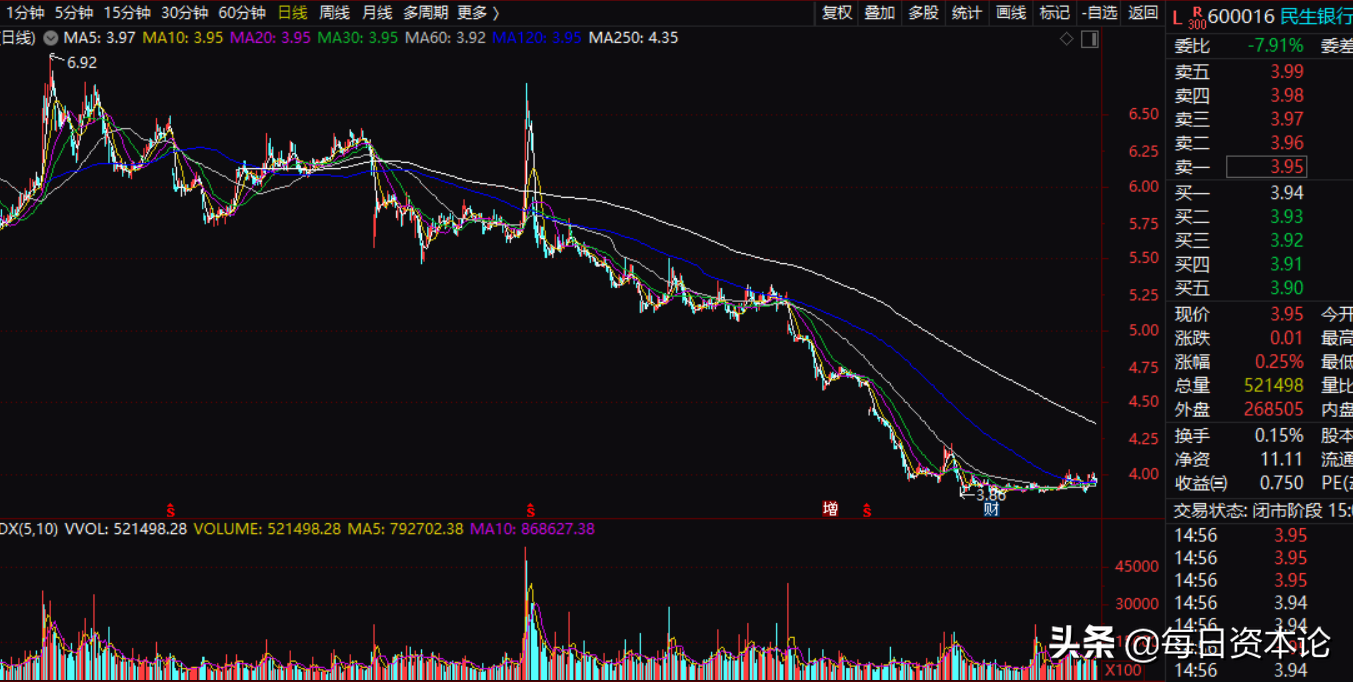 2月16日,中国民生银行股份有限公司(下称 民生银行)股价小幅高开后呈现窄幅震荡走势。截至当日收盘其股价为3.95元,比上个交易日上涨一分钱,微涨0.25%,总市值1729.41亿元。