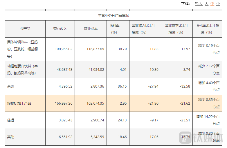 值得注意的是,维维股份的主要业务,包含固体冲调、动植物蛋白饮料、以及粮食加工业务的毛利率也都有所缩减,其中,动植物蛋白饮料业务减少超7个百分点。