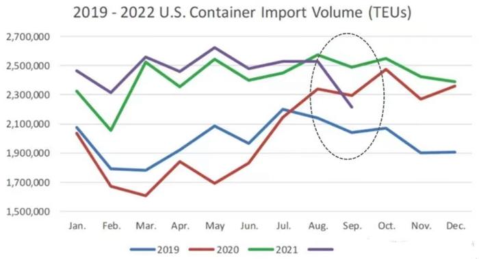 值得注意的是,不仅是钢铁,全球进口需求放缓已成为过去一个月的基调。美国作为中国最大贸易国,进口数据下降的尤其明显。根据美国贸易数据服务提供商笛卡尔(Descartes)发布的《10月全球航运危机报告》显示,受经济放缓、零售商减少采购、通货膨胀和高燃料成本等因素的影响,与2021年相比,2022年9月的标准箱数量下降了11.0%,降至2215731箱。