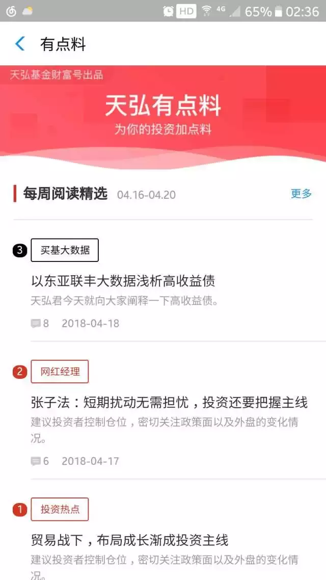 天弘基金的“有点料”栏目:一共分为5个标签“网红经理”、“投资热点”、“撩基攻略”、“新手必读”、“买基大数据”。每周不定板块更新,为购买基金提供丰富的指引,页面倒是有点单调。