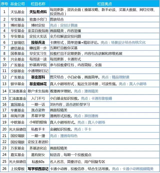 投教类栏目(26个),基金公司需转变思路,依据小白用户阅读习惯输出浅显、生动内容,打造公司形象IP;