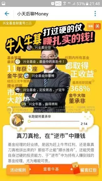 兴全基金"小天后聊Money",音频形式,页面展示公司的优秀业绩,且内容相对紧凑,排版规范,使投资者加强投资信心;