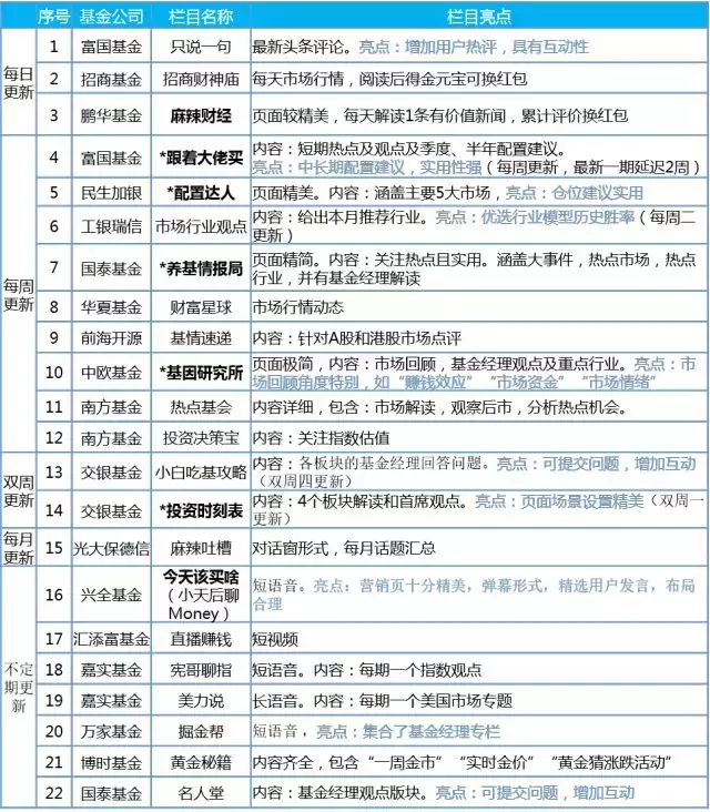 2、从栏目内容看,基金公司一般会抽取主要市场和热点专栏进行分析,按内容顺序具体来看 1)行情回顾(不同市场,板块走势、重大事情、基本面分析、风险点提示、后市分析、关注) 2)基金经理进行回答(整体解读、问答、独到观点) 3)最后资产配置建议(推荐行业、不同投资周期配置建议,比如富国基金“跟着大佬买”建议涵盖中长期,更具有远瞻性)等。
