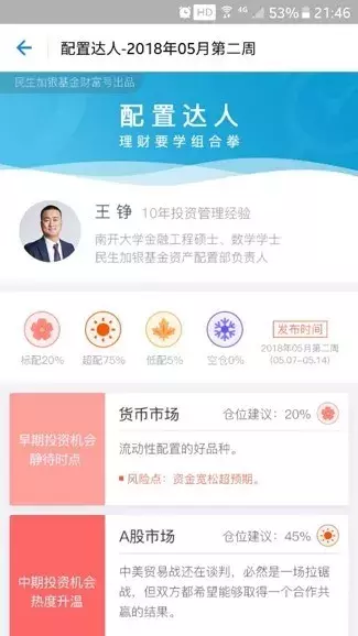 民生加银的“配置达人”,涵盖5个市场分析,内容简洁,仓位配置建议一目了然;