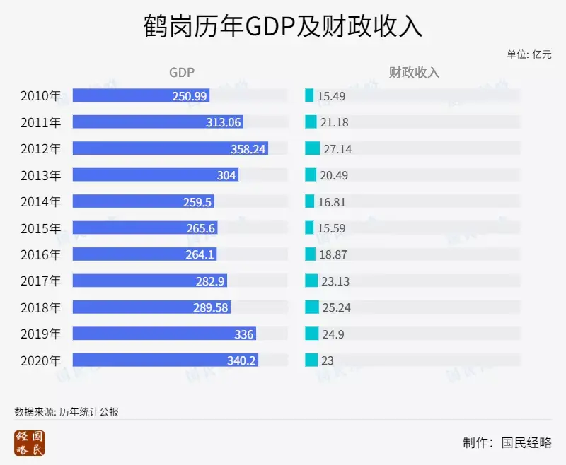 如今,鹤岗的GDP还未回到10年前的峰值,而每年的财政收入仅有20多亿,相当于财政支出的1/6左右。
