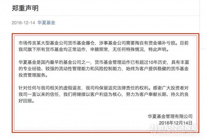 对于这一传闻,21世纪经济报道记者第一时间与华夏基金取得了联系,对方回复称:“这绝对是谣言,我们公司没有货币基金爆仓事情发生。”
