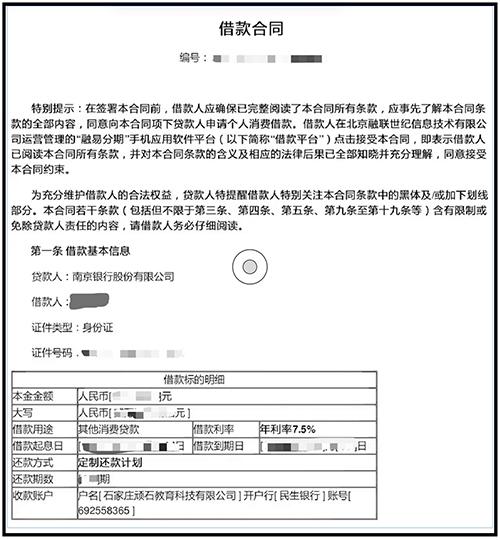 林希出示给记者的借款合同长达15页,其中显示,这笔贷款实质上属于消费贷款,贷款人为南京银行股份有限公司,贷款用途为“其他消费贷款”,本金两万余元,还款分期为两年共20余期,年利率7.5%。收款方则是一家名为“石家庄顽石教育科技有限公司(下称‘顽石教育’)”的开户行。