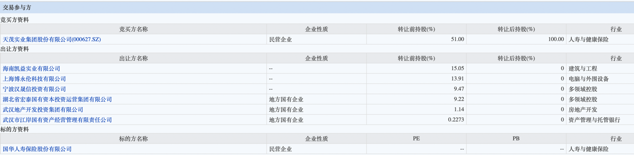 同一日,天茂集团发布了一则“筹划发行股份购买资产事项暨关联交易停牌”的公告,称拟通过发行股份购买资产或发行股份购买资产结合其他多种支付方式,收购海南凯益实业有限公司(下称“海南凯益”)、上海博永伦科技有限公司(下称“上海博永伦”)、宁波汉晟信投资有限公司(下称“宁波汉晟信”)、湖北省宏泰国有资本投资运营集团有限公司(下称“湖北宏泰”)、武汉地产开发投资集团有限公司(下称“武汉地产”)、武汉市江岸国有资产经营管理有限责任公司(下称“江岸资管”)等六家股东合计所持国华人寿49%的股权,对国华人寿进行吸收合并。