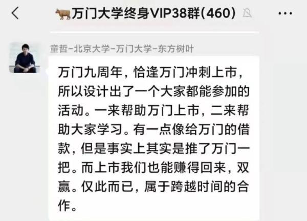 童哲在群里说“奖学金计划”活动是为了“万门上市”。(受访者供图)