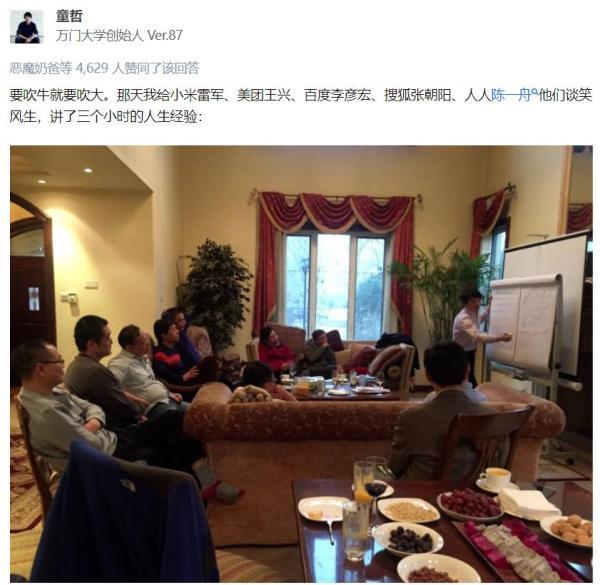 2017年,他在知乎中忍不住发文,炫耀跟小米雷军、美团王兴、百度李彦宏、搜狐张朝阳、人人陈一舟等谈笑风生。