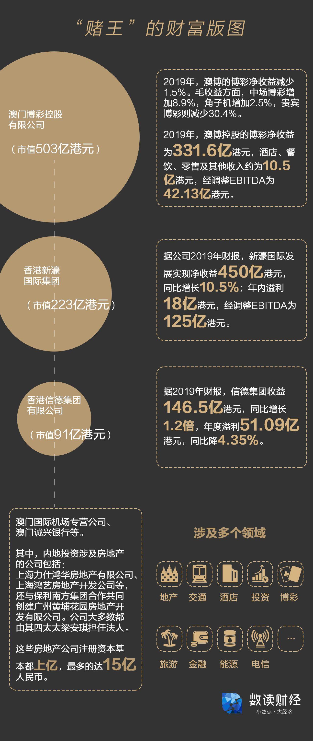 澳博控股是何鸿燊最核心的资产,自1961年,何鸿燊一举拿下澳门赌场独家专营权,此后独揽赌权四十年,一步步夯实自己“赌王”的地位。截至2020年5月27日午间,澳博控股的市值达到了503亿港元。