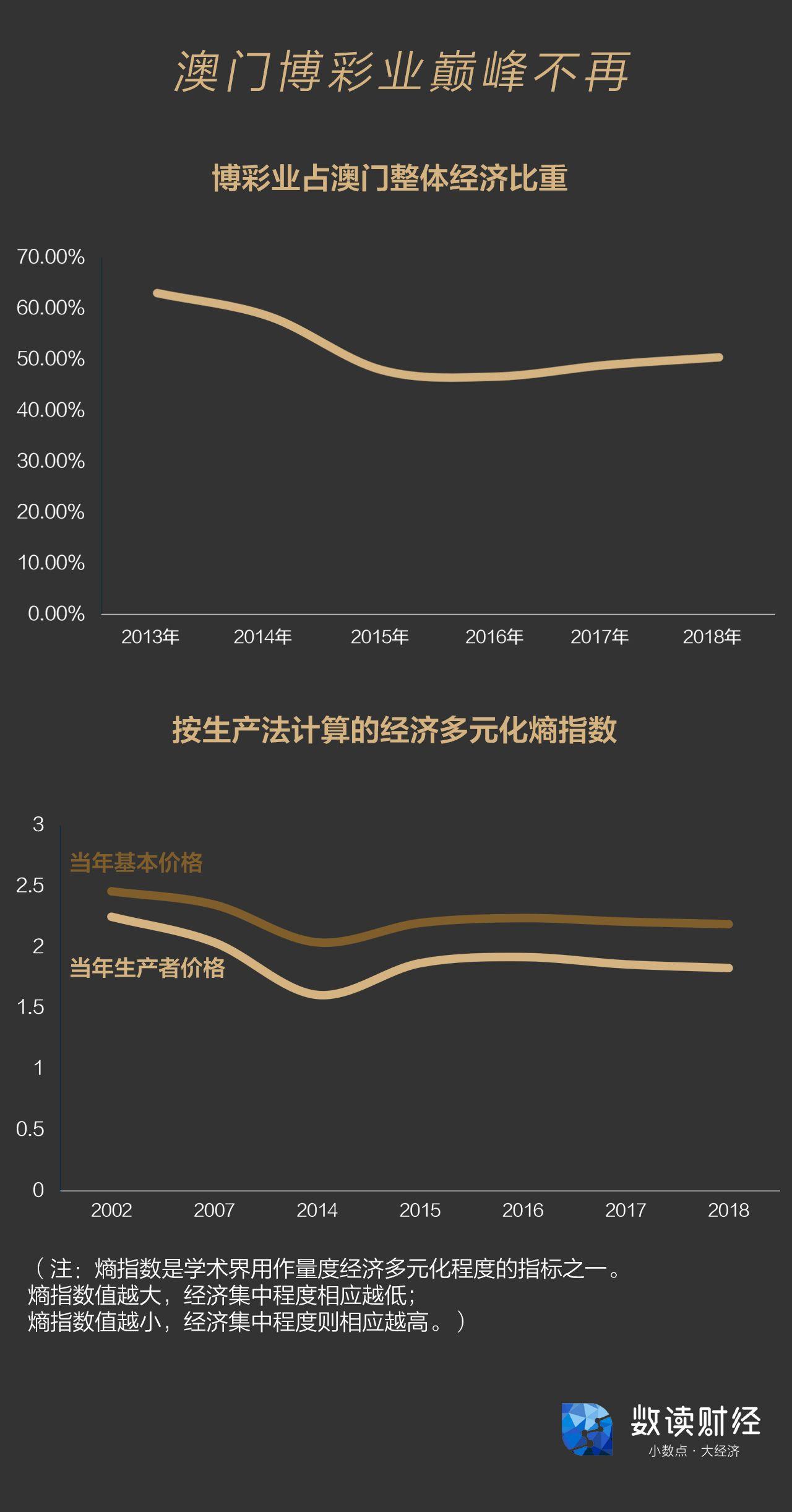 2019年12月13日,澳门特区政府公布2018年度《澳门经济适度多元发展统计指标体系分析报告》显示,博彩业在澳门整体经济比重由2013年的63.1%降至2018年的50.5%。