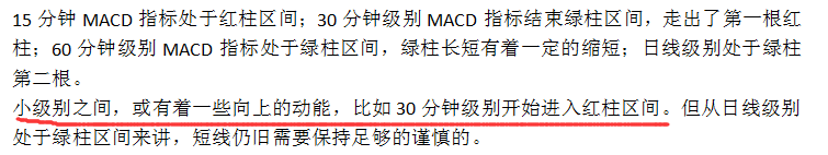 15分钟级别MACD指标处于红柱区间,红柱有着一定的背离;30分钟级别MACD指标处于红柱区间,红柱长度增长情况有所趋缓;60分钟级别MACD指标结束绿柱区间,走出红柱第一根;日线级别MACD指标处于绿柱区间,绿柱长度因为今天的上涨,有着一定的趋缓。