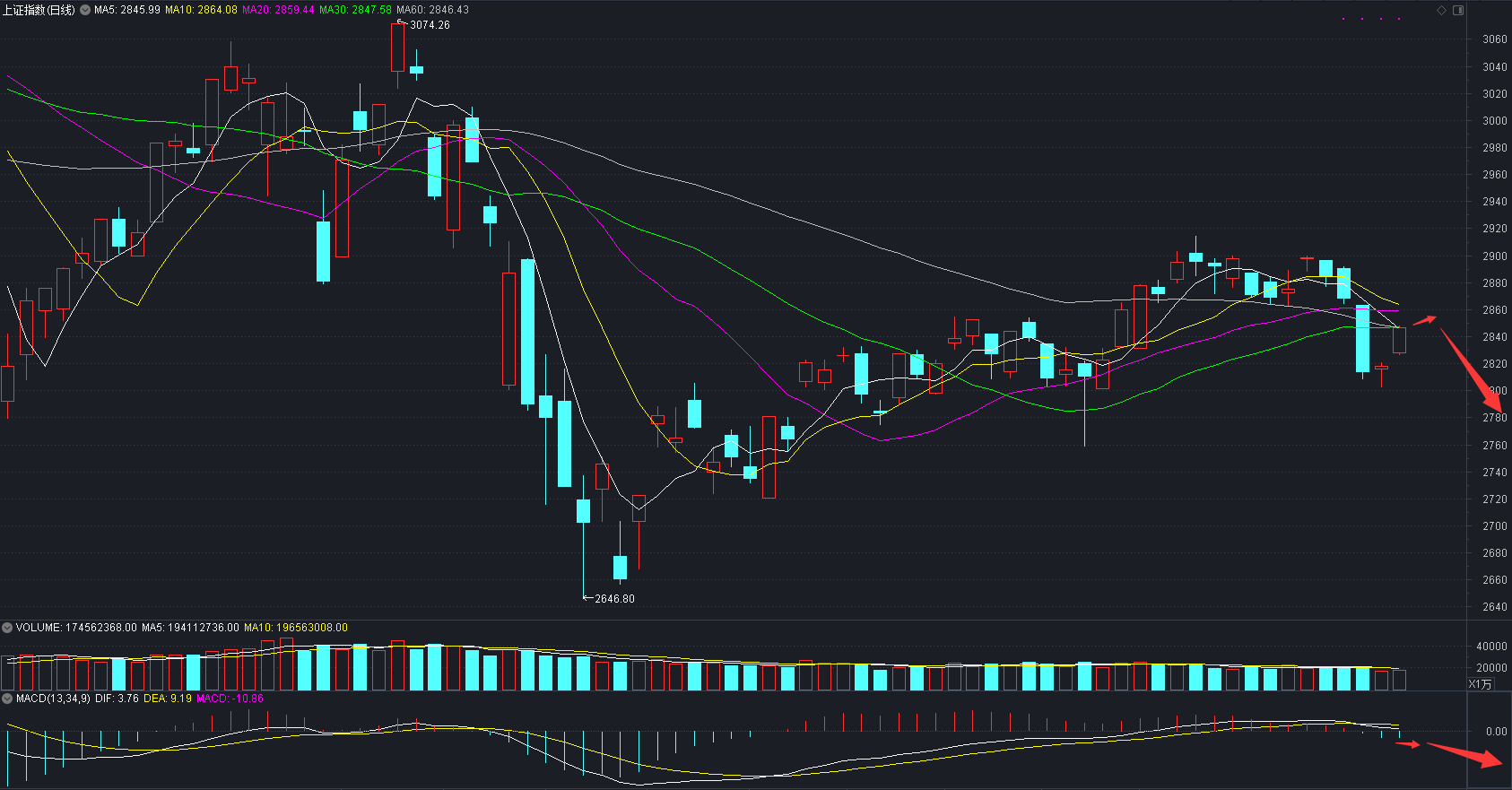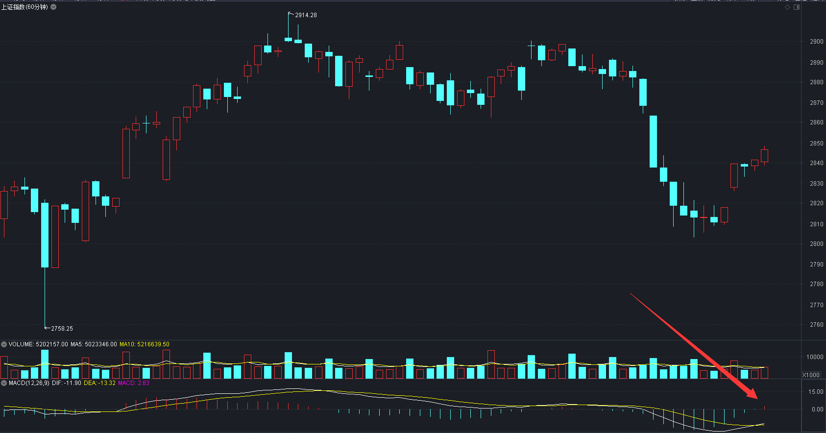 但是,当前日线级别仍旧处于绿柱区间,短线该注意的风险还是要注意的。从均线的位置来看,今天上证指数的上方刚好顶着5日、30日、60日均线,位置上还是有压力存在的,并且上方还有10日、20日均线的压力。虽然今天量能较昨天有所增加,但成交量仍旧不大。个人的想法是,明天或还有一些时间的反弹,但不会很长,之后会再次有着下跌。