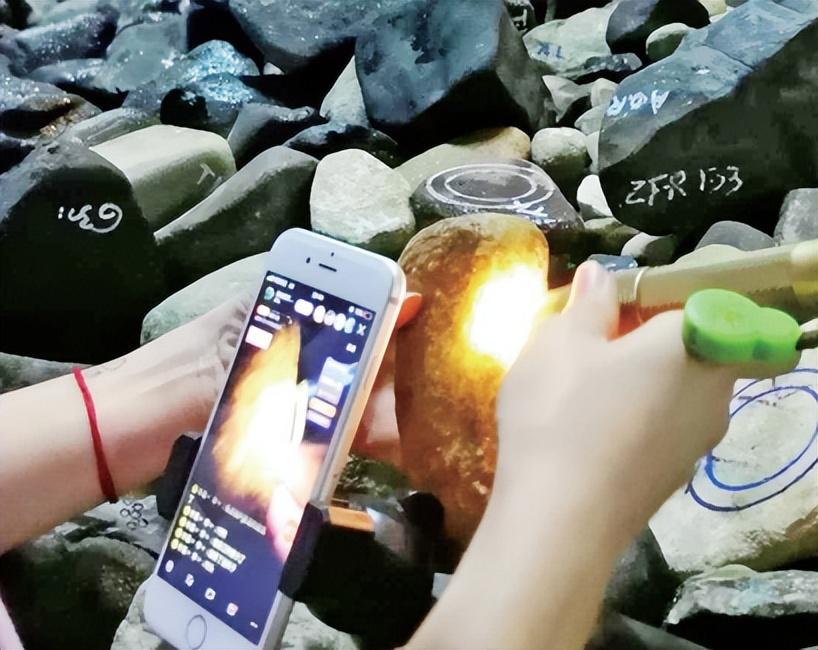 直播间里光线昏暗。自称“阿亮”的男主播一手捧着石料,一手举着手电筒,口中念念有词:“老铁们,上好的料子,速来‘秒’啦!”只见石料的表面黢黑,泛着油光,看上去就是一块普通的石头。阿亮用手电筒对着石料的表面,环绕游走。在光线的照射下,石料透出青翠欲滴的绿光。助理小伟、小华扯开嗓子吆喝:“一刀穷,一刀富,一刀土豪路。家人们,这块料子加工成戒面、玉牌,太漂亮啦!”