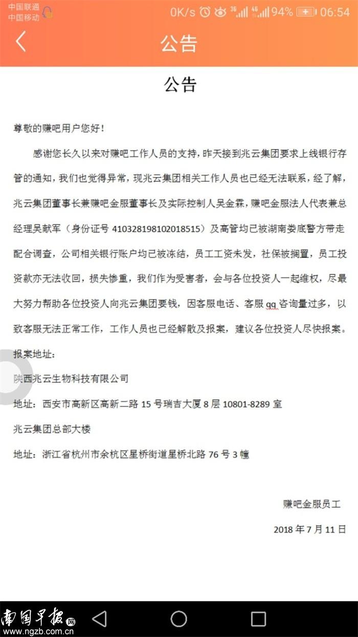7月11日,赚吧金服微信群里又出现了一份落款为“赚吧金服员工”的公告,赚吧金服法人代表兼总经理吴某军及高管均已被湖南娄底警方带走配合调查,公司相关银行账户均已被冻结。目前,员工工资未发、社保被搁置,员工投资款亦无法收回,他们作为受害者,会与投资者共同维权,同时建议各位投资人尽快报案。