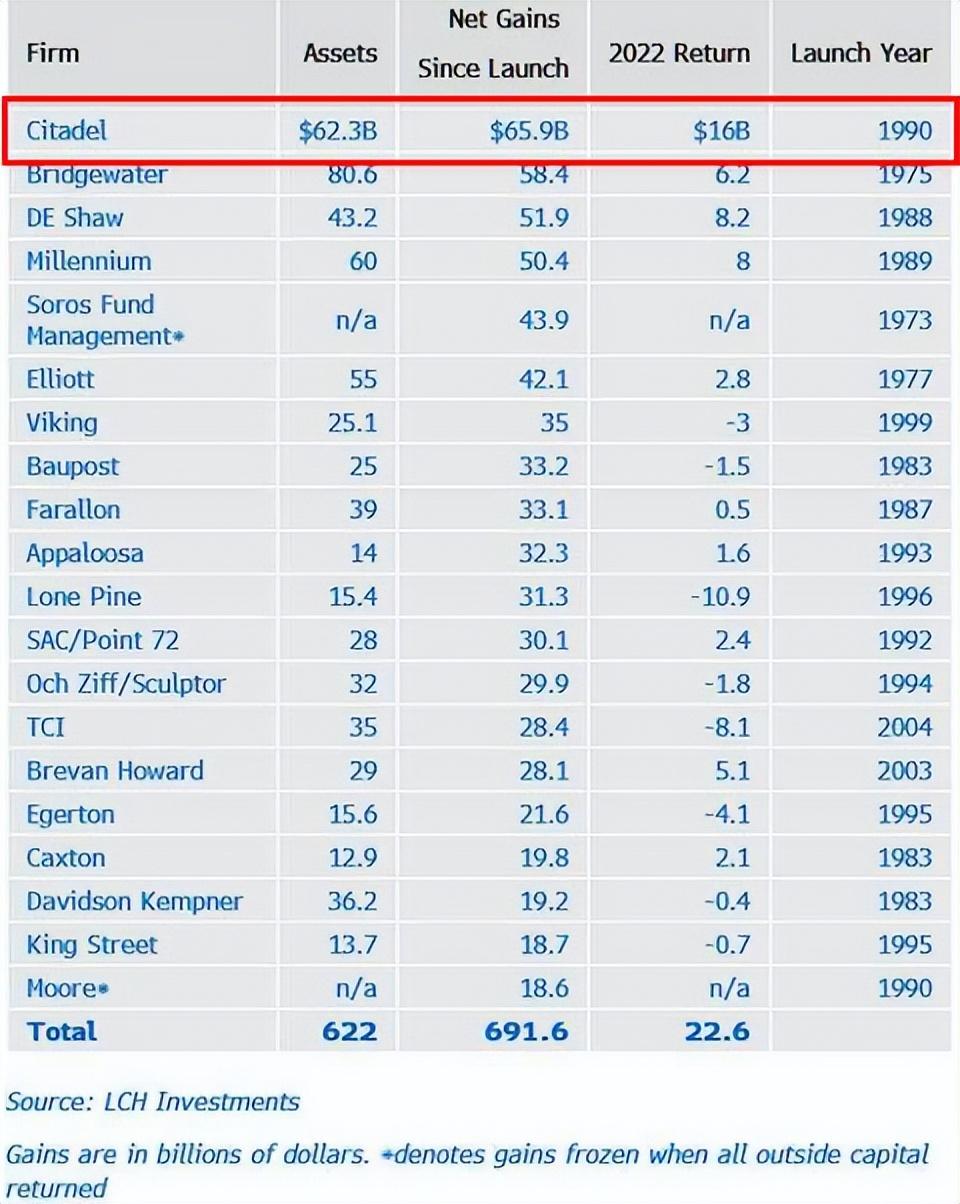 数据显示,城堡投资在2022年的整体毛收益达到280亿美元。根据罗斯柴尔德集团旗下对冲基金母基金管理机构LCH Investments发布的“全球最赚钱对冲基金榜单”,在扣除120亿美元巨额管理费/分成的前提下,城堡投资2022年依然为投资者带去了160亿美元的收益。