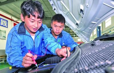 在贵州省黔东南苗族侗族自治州岑巩县中等职业学校,学生在实训室学习汽车修理技术。新华社发