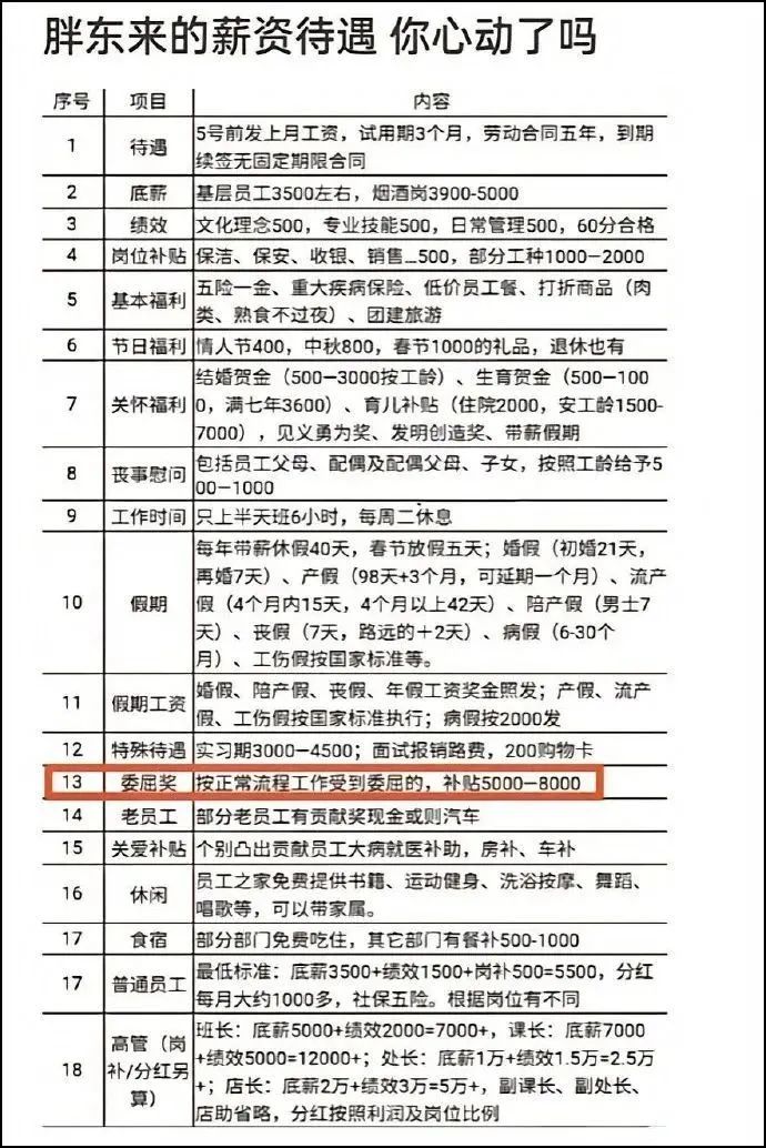 3月26日网上的流传的一张薪资待遇图片显示,除了正常的薪水外,胖东来员工还有节日福利、岗位补贴、假期工资等,尤其是“委屈奖”引发网友关注。