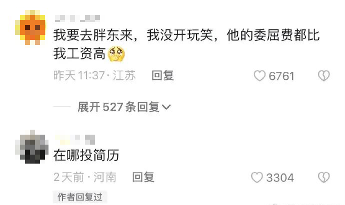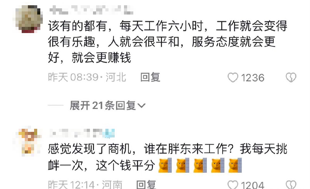 网友对此议论纷纷▼有人问“在哪投简历?”还有人调侃,“去胖东来上班不要工资,只要每个月委屈两次”;“求求胖东来让我来上这个班”;“胖东来才是我的梦中情职”。