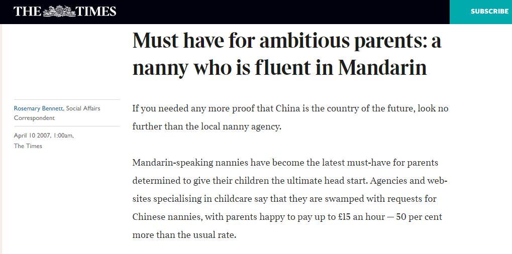 2007年,泰晤士报网站就作过报道,会讲中文的保姆变成了伦敦城内望子成龙的家长们“必须拥有”的家政人才,这些保姆的时薪最高能达到15镑/小时,比当时的平均时薪高出50%左右。