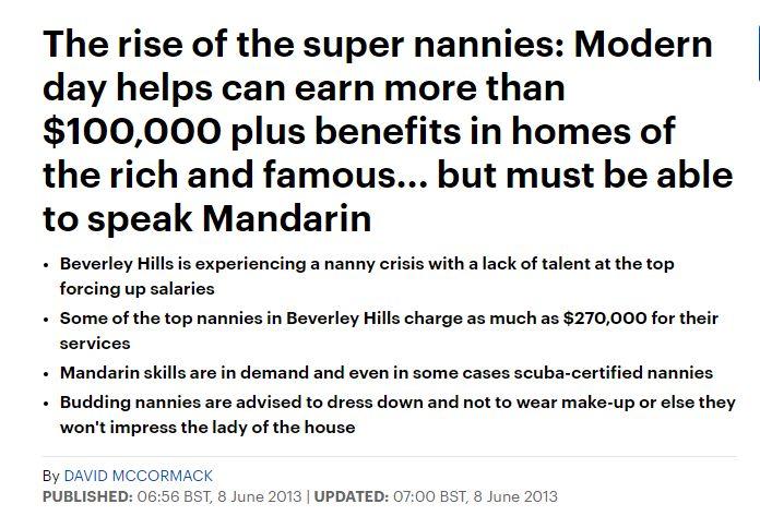 据Daily Mail, 2013年美国明星名流云集的“有钱山庄”Beverley Hills完全进入了重金求中文保姆的状态,急,在线等。顶级“超级保姆”的薪水几乎可以媲美律师。