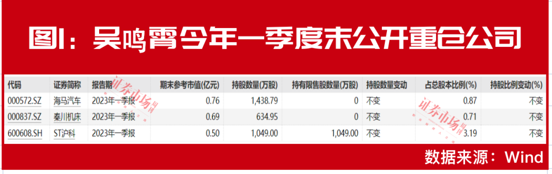 今年一季度末,吴鸣霄共现身于海马汽车、秦川机床、ST沪科3家公司的前十大股东/流通股东阵营,累计公开持仓1.95亿元(见图1)。