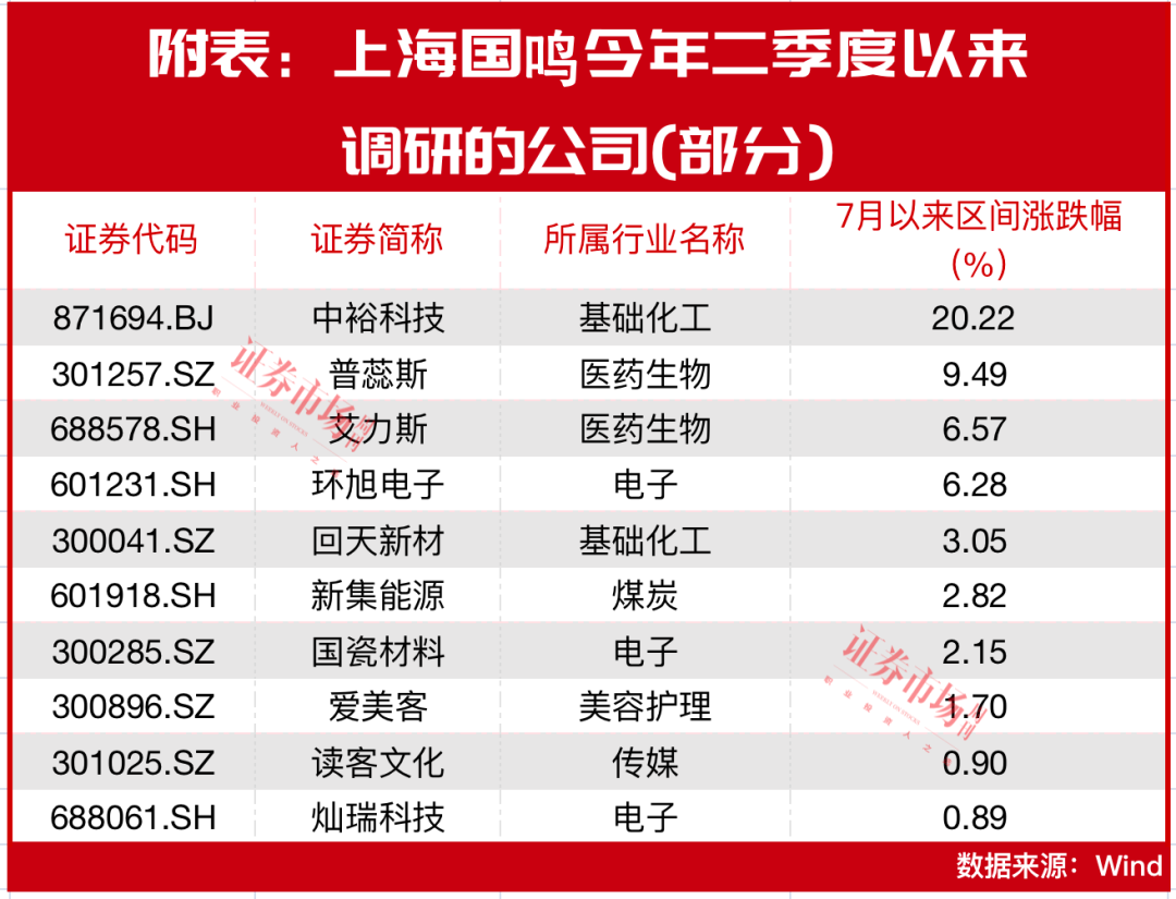 上海国鸣调研的方向,与市场总结的“博重组-创业板-投前沿”吴鸣霄投资三部曲相吻合。并且这些公司在今年7月以来普遍表现较好,如中裕科技区间累计大涨超20%,普蕊斯、艾力斯等同样迎来大涨。若吴鸣霄对这些公司有所布局,或为其身价的提升再次增砖添瓦。