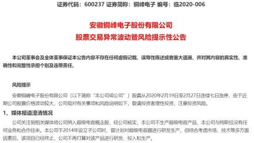 期间,铜峰电子还发布了风险提示公告。2月25日晚间,公司公告称,公司没有生产超级电容产品,也未与特斯拉有相关合作。但依然未能阻止投资者在二级市场对公司的追捧。