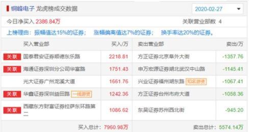 2月27日,龙虎榜数据显示,前五大营业部共买入7960.98万元,卖出5574.14万元,净买入2386.84万元。