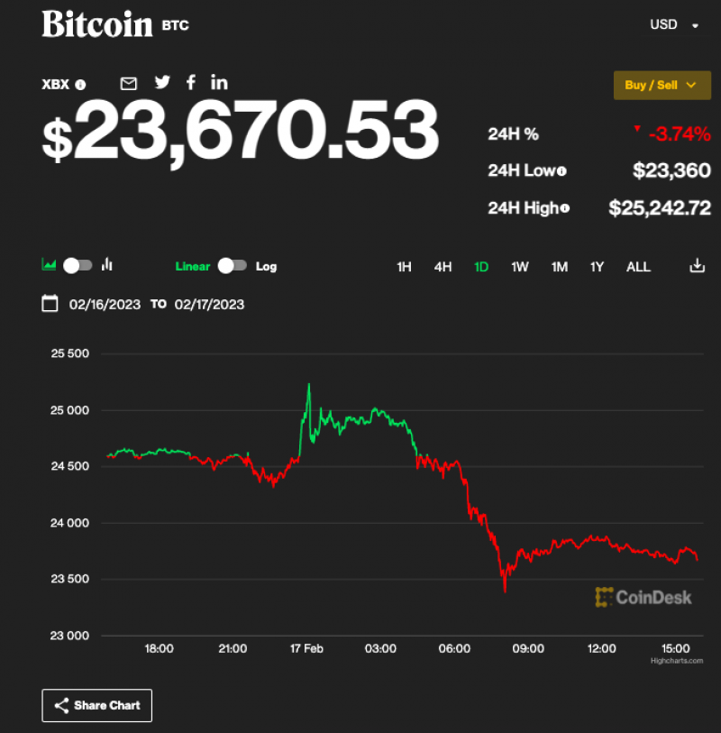 2月16日,比特币交易价格持续上行,并在17日凌晨突破25000美元关口,24小时涨幅超过10%,刷新自2022年8月以来比特币的最高交易价格。然而,狂欢尚未开始,比特币价格便大幅回落,出现约一周以来最大跌幅,一度跌超4%。截至记者发稿,比特币价格已回落至23670.53美元,24小时内下跌3.74%。