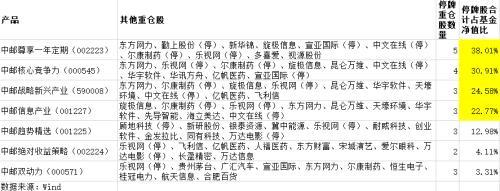 其中,中邮尊享一年定期(002223)的前十大重仓股中更是有5只停牌股,合计占基金净值的38%以上。