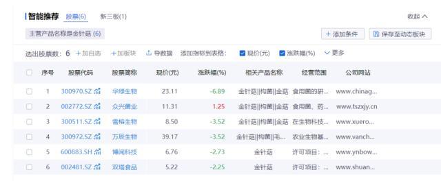 据同花顺iFinD数据统计,目前A股市场约有6家主营金针菇的上市公司。截至4月25日收盘,众兴菌业、雪榕生物市值超40亿元,万辰生物市值超60亿元。