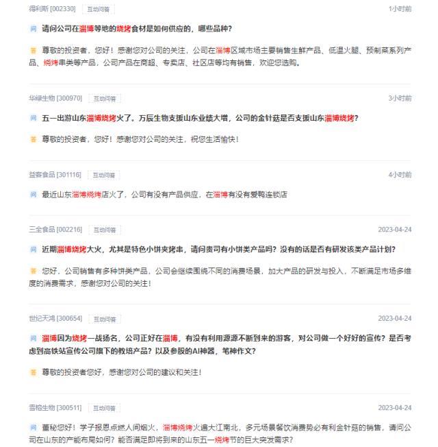除了金针菇概念股,在交易所互动平台上,还有不少食品类公司也被投资者问及“淄博烧烤”的相关问题。
