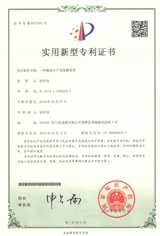 近日,中国食品报记者独家从四川翠微食品有限责任公司获悉,该公司申报国家知识产权局的“通过生物发酵技术生产无盐酱油”发酵工艺技术,正式获批回复,获得实用新型专利证书(证书号第8471002号)。这项专利技术对全民减盐行动提供了有力的支持。该项成果解决世界难题填补世界空白,对促进人类健康具有重大的现实意义。